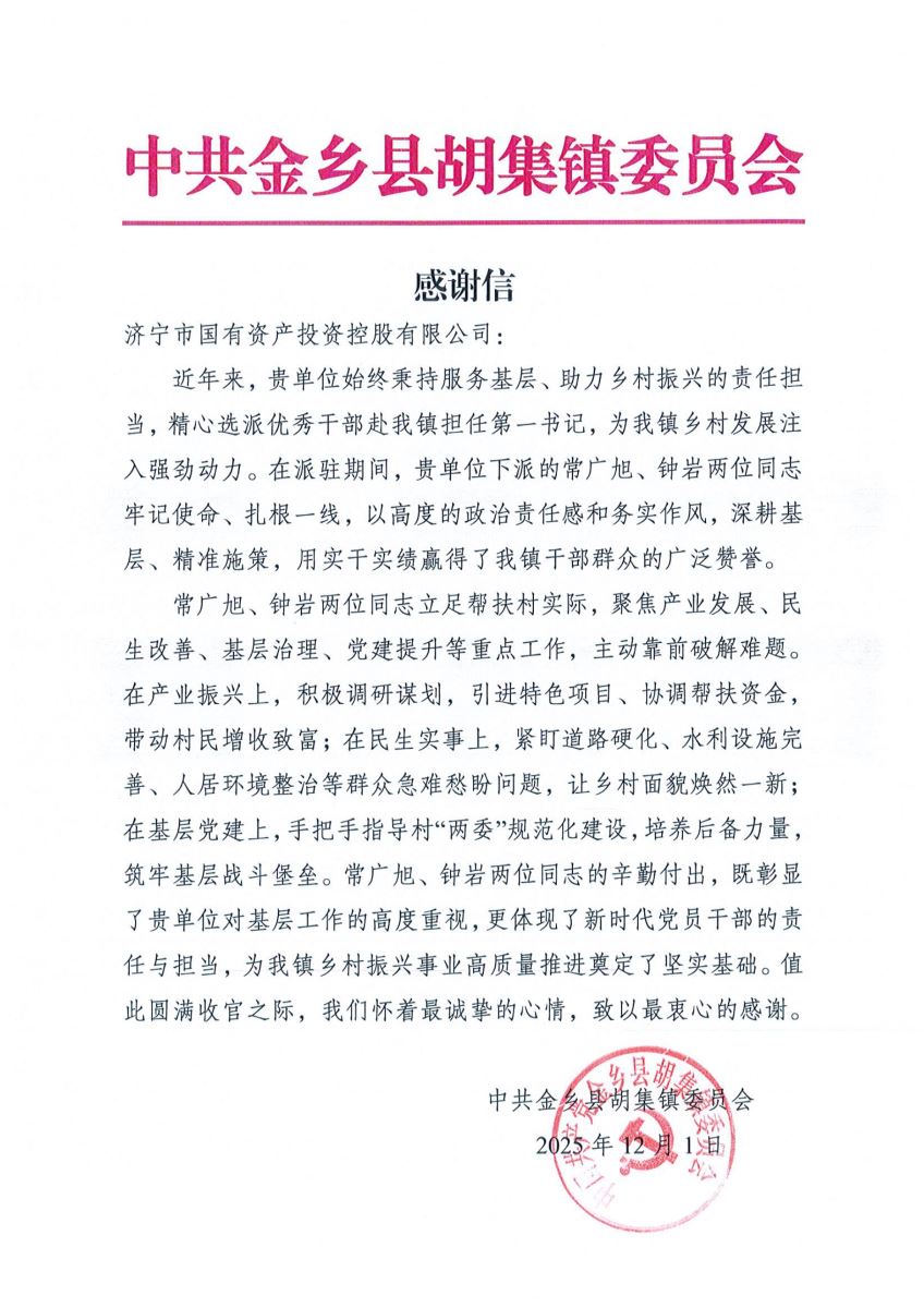 胡集镇党委在感谢信中表示,济宁国投始终秉持服务基层、助力乡村振兴的责任担当,精心选派优秀干部赴镇担任第一书记,为当地乡村发展注入强劲动力。常广旭、钟岩两位同志牢记使命、扎根一线,以高度的政治责任感和务实作风,聚焦产业发展、民生改善、基层治理、党建提升等重点任务,主动作为、精准施策,赢得了镇村干部群众的广泛赞誉。