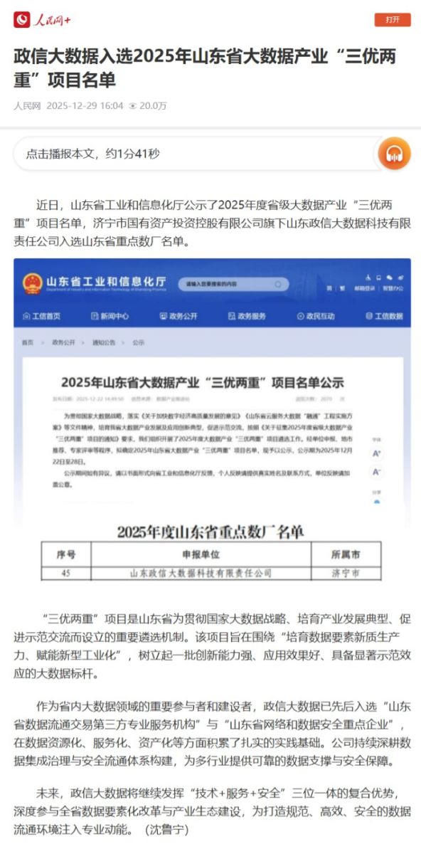 《人民网》| 政信大数据入选2025年山东省大数据产业“三优两重”项目名单